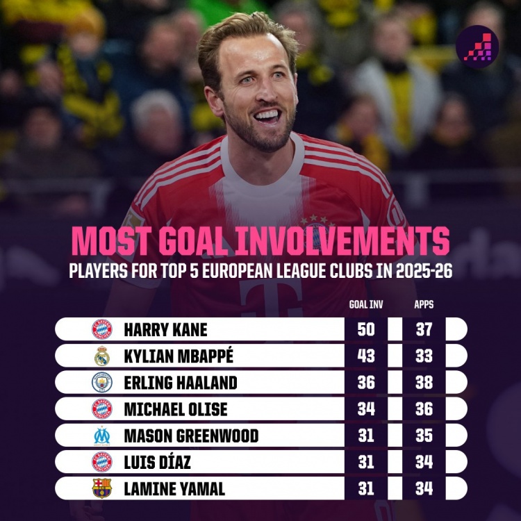 球速平台-本赛季五大联赛球员参与进球榜:凯恩50球居首,姆巴佩43球次席