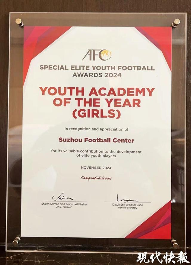 2024年11月,青少年高水平后备人才基地(苏州)在第三届亚足联女子足球大会上获得年度青训特别奖——年度青训学院(女子)Youth Academy of the Year(Girls),成为国内首个获得该奖项的青训单位。
